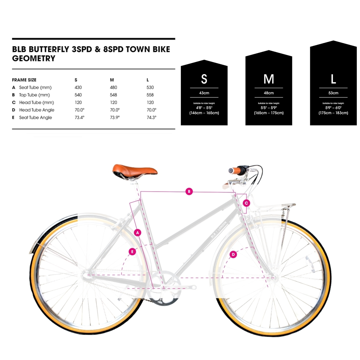 Fact Sheet of BLB BUTTERFLY – Women City-Bike – 2022 – dusty pink Product Name: BLB BUTTERFLY – Women City-Bike – 2022 – dusty pink Manufacturer: BLB Bikes Item Code: BBK612278 activity: Cycling gender: women material: Steel usage bikesport: City hubs: High Flange Polished ,Shimano Polished rims: Classic Double Wall Polished cassette: Shimano shifter: Shimano Acera rear derailleur: Shimano Acera ,8-speed bottom bracket: BLB ,Sealed chainring ratio: 46 crankset: BLB City Singlespeed brakes: BLB Caliper seat post model: BLB Alloy saddle: BLB Comfort handle bar: BLB Half Moustache City stem: BLB Quill polished ,80mm fork: CrMo 4130 headset: Chrome 1'' frame: 4130 Steel ,Double Butted groupset: Shimano number of gears – front: 1 shifting system: 8-speed shifting actuation: Mechanical bike extras: with Fender ,with Carrier brake type: Rim Brake wheel size: 28" (622mm) bike special accessories: Stainless Steel Front Rack (max. 15kg) ,Kickstand grips: Synthetic leather seatpost: Seatpost rigid pedals: BLB City ,silver tires: BLB City ,700×32 brake actuation: Mechanical Model year: 2022 Color: Pink fork construction: Rigid Fork weight: 12500g cable routing: external Weight Source: Manufacturer Manufacturer page: https://www.bricklanebikes.co.uk/ |