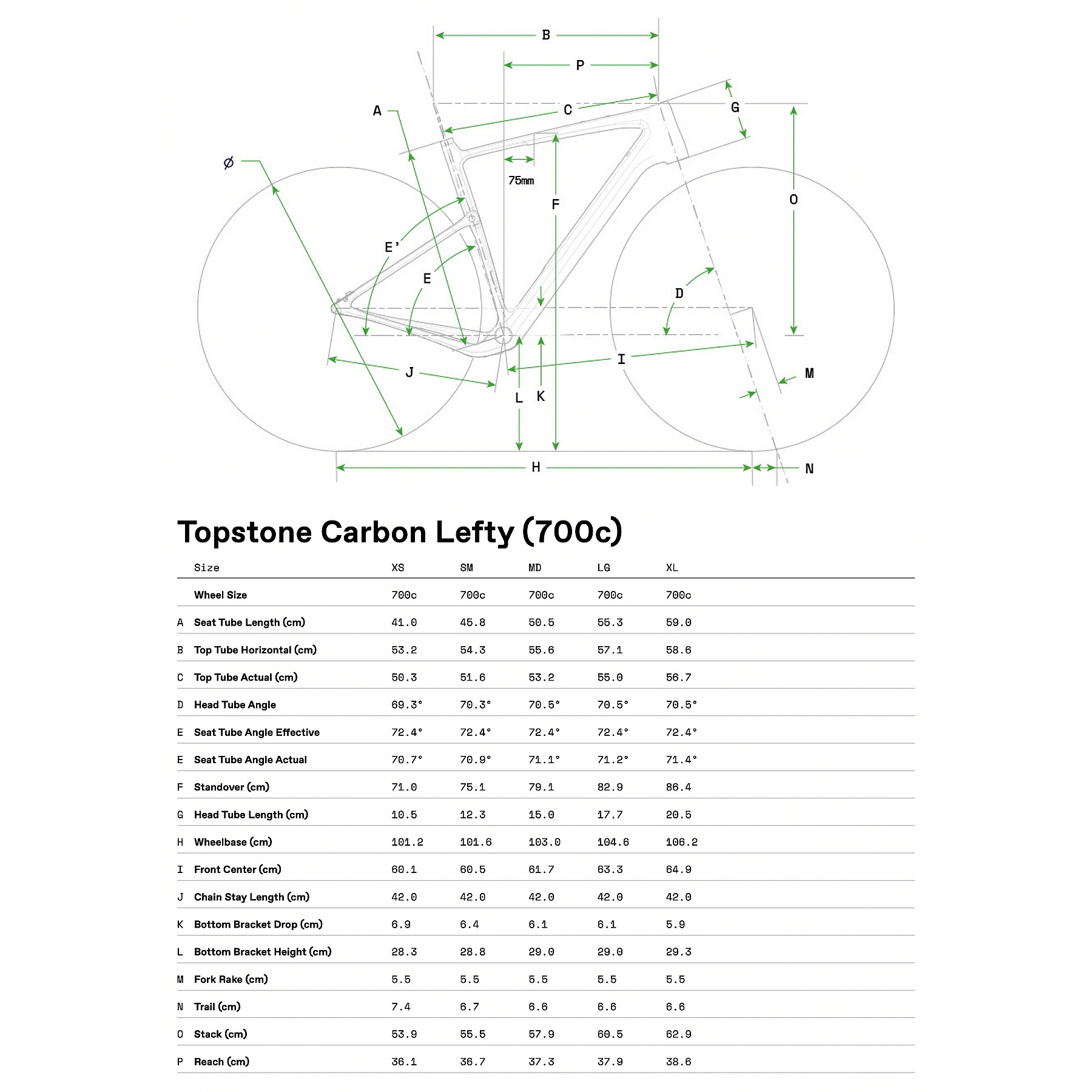Fact Sheet of Cannondale TOPSTONE Carbon 2 Lefty – Gravelbike – 2023 – green Product Name: Cannondale TOPSTONE Carbon 2 Lefty – Gravelbike – 2023 – green Manufacturer: Cannondale Bikes Item Code: CAD639259 activity: Cycling gender: men material: Carbon usage bikesport: Allroad / Gravel hubs: Lefty SL / Shimano MT410 Centerlock Disc spokes: Stainless Steel ,14g rims: WTB KOM Light i23 TCS chain: Shimano HG M7100 cassette: Shimano SLX M7100 shifter: Shimano GRX 820 rear derailleur: Shimano GRX 822 ,Shadow RD+ bottom bracket: Shimano BSA 68mm chainring ratio: 40 crankset: Shimano GRX 610 brakes: Shimano GRX 800 ,160/160mm seat post model: Cannondale DownLow Dropper ,27.2 saddle: Fizik Terra Argo X5 bar tape: Fizik Solocush Soft handle bar: Cannondale 2 ShortDrop ,12° flare drop stem: Cannondale 2 fork: Lefty Oliver ,Chamber Damper ,ISO High-Ride ,55mm Offset headset: Integrated / Carbon ,1-1/8" – 1-1/2" frame: Topstone Carbon ,Kingpin suspension ,12x142mm groupset: Shimano gear ratio: 10-45 number of gears – front: 1 shifting system: 12-speed shifting actuation: Mechanical brake type: Disc Brake wheel size: 28" (622mm) bike special accessories: Cannondale Wheel Sensor ,StrapRack toolholder seatpost: Dropper post travel fork: 30mm tires: Vittoria Mezcal ,700x44c max tire width: 53mm brake actuation: Hydraulic Model year: 2024 Collection: Full year Color: Green fork construction: Lefty manufacturer item code: C15203U cable routing: internal Manufacturer page: http://www.cannondale.com/eur_de |