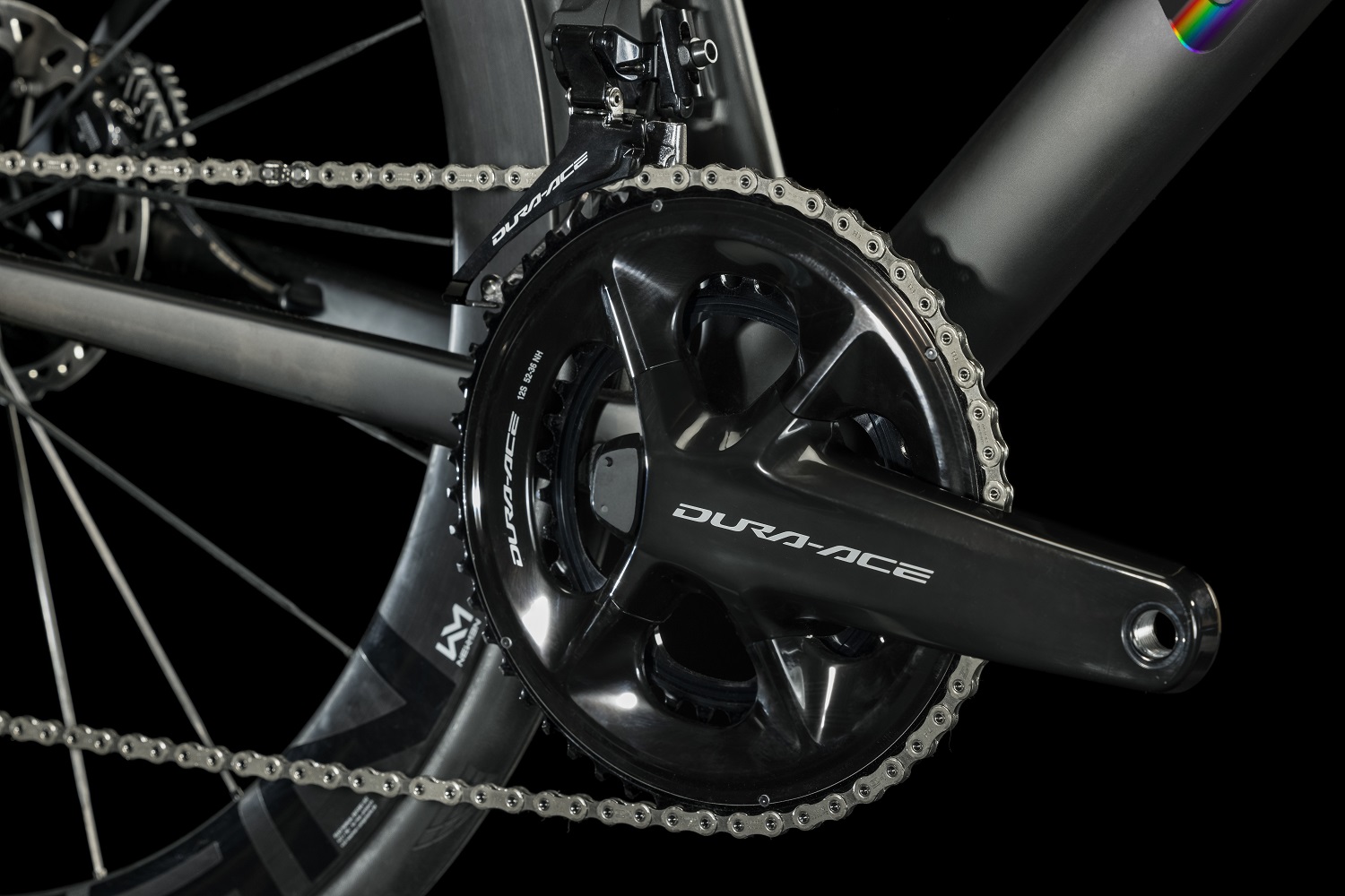 Shimano’s range-topping Dura Ace Di2 components – with built-in power meter – transfer your power to the road and bring you safely to a stop. There’s fast, and there’s very rapid indeed. Guess which one this bike is?