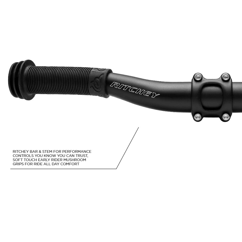 - Handlebars and stem by “Ritchey” provide control and a wheel that steers well