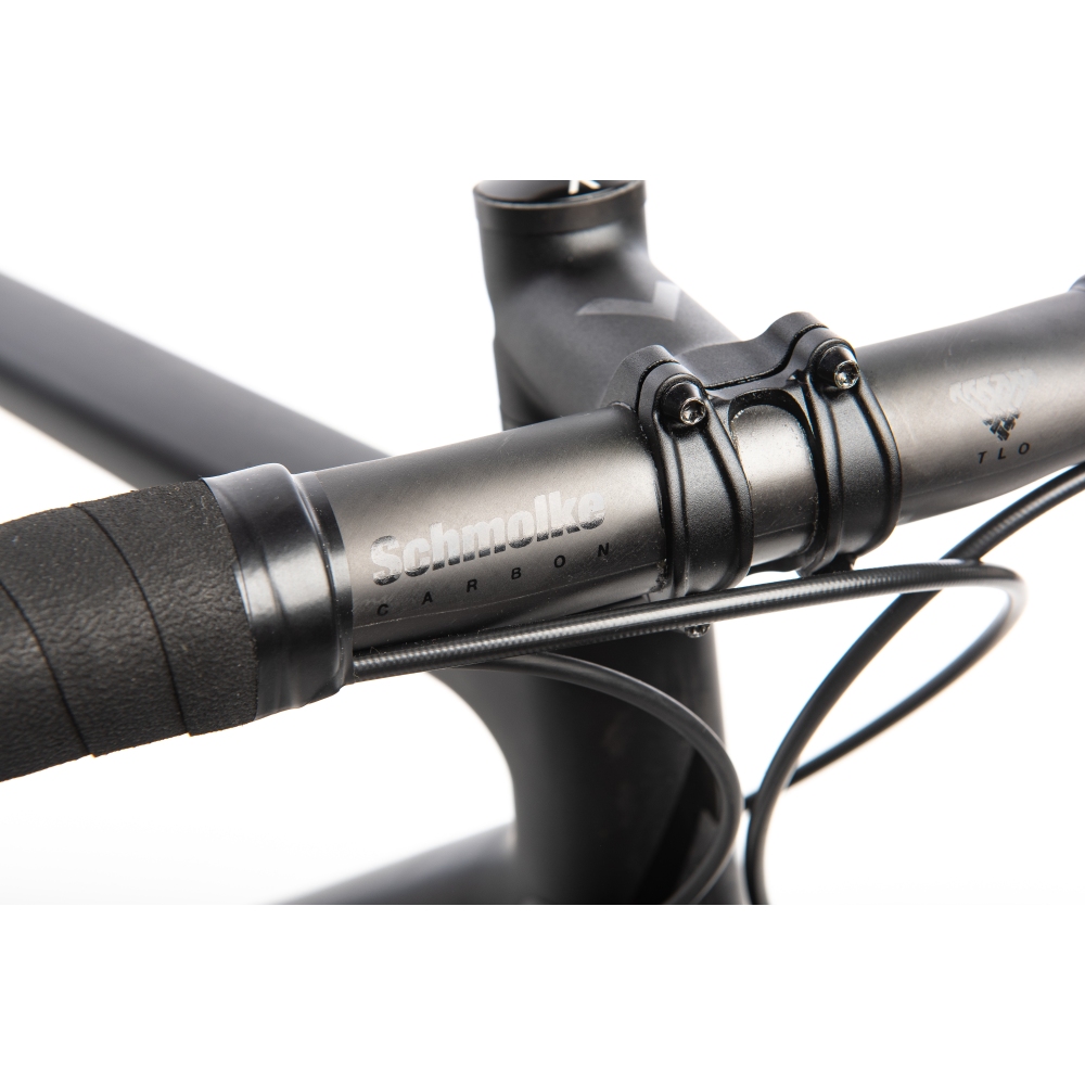 Cockpit cables are routed externally for quick accessibility in case of defects and easier maintenance. The classic handlebar stem setup also offers maximum customizability. At 150 grams, the Schmolke Carbon handlebar is one of the lightest of its kind. The damping properties of the handlebar are maximally comfortable in all road conditions, steering impulses are readily and quickly implemented even at high speeds and in difficult situations.