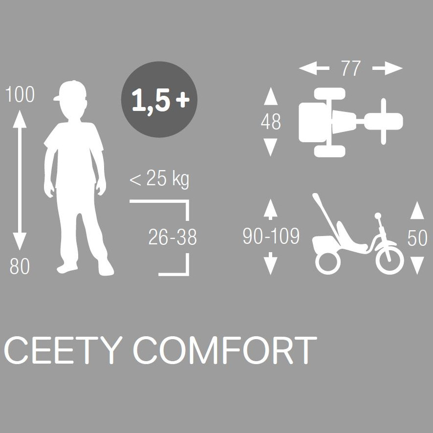 In addition to a flexible umbrella, CEETY Comfort has a removable tipper body and a bell suitable for children. The vehicle is equipped with a safe 3-point belt system, which holds the pilot securely in the seat, but does not restrict freedom of movement. The freewheel can be locked optionally. A removable anti-slip footrest with angle adjustment supports the child during a resting phase. This allows you to transport the sleeping child easily and safely. The maintenance-free comfort tires and ball-bearing wheels guarantee smooth running and a long service life. The standard repertoire also includes safety handlebar grips and an impact-resistant powder coating naturally.