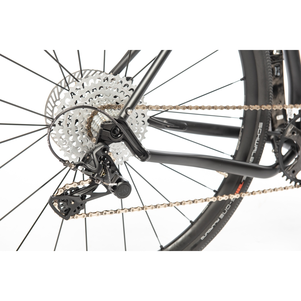 In addition, the frame can accommodate a specially designed luggage rack. A specially designed carbon seatpost with leaf spring design in the head area also gives excellent flex. In addition, the seat stay on the right side was pulled down to provide more space for the chain, especially for the modern 1x drives. With optimized tube shapes, a track-precise fork and the Campagnolo EKAR shifting group, this wheel represents in every respect a new benchmark among the Gravel bikes.