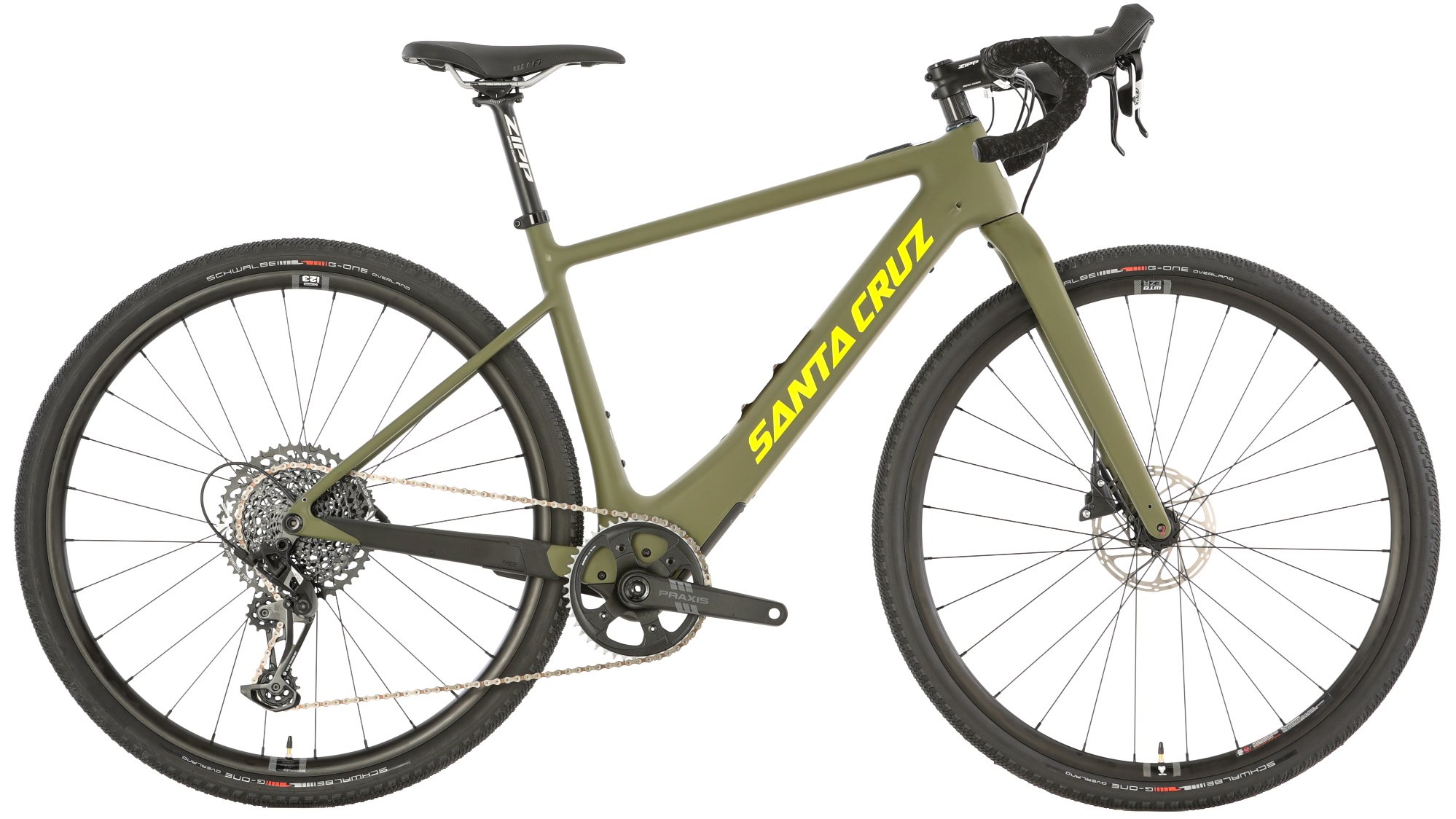 The Apex version of the Santa Cruz Skitch comes with a SRAM Apex Eagle 12-speed drivetrain. This includes a cassette that has a hill-crushing 10-50T gear range that makes climbing and pedaling through difficult terrain much easier. SRAM Apex hydraulic disc brakes provide excellent stopping power so you can descend with confidence. WTB EZR i23p rims are paired with Schwalbe G-One Overland Evo Tires that can be set up tubeless for a smoother ride, better traction, and fewer flats.