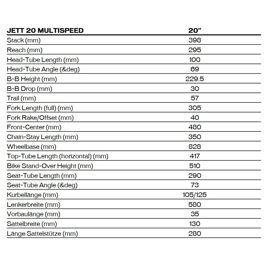 6° fork: A1 Premium Aluminium frame: A1 Premium Aluminium groupset: microSHIFT gear ratio: 11-34 number of gears – front: 1 shifting system: 7-speed shifting actuation: Mechanical brake type: Rim Brake wheel size: 20" (406mm) grips: Jett Body Geometry seatpost: Seatpost rigid pedals: Nylon tires: Pathfinder Sport