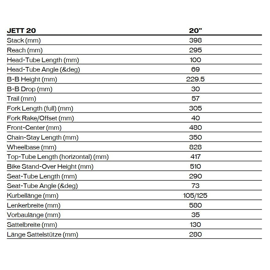 Fact Sheet of Specialized JETT 20 Singlespeed – 20" Children's Bike – 2023 – flo red / white Product Name: Specialized JETT 20 Singlespeed – 20" Children's Bike – 2023 – flo red / white Manufacturer: Specialized Bikes Item Code: SBC531910 activity: Cycling gender: kids material: Aluminium hubs: Aluminium rims: Aluminium chain: KMC Z1 EPT bottom bracket: Square-Tapered ,113mm chainring ratio: 34 crankset: Aluminium brakes: V-Brakes seat post model: Aluminium ,27.2mm ,14mm Offset saddle: Kids Bridge handle bar: Mini Rise ,60mm Rise ,5° Backsweep ,580mm stem: Aluminium ,35mm ,6° fork: A1 Premium Aluminium frame: A1 Premium Aluminium groupset: None gear ratio: 18 number of gears – front: 1 shifting system: Single Speed (1/8") shifting actuation: None brake type: Rim Brake wheel size: 20" (406mm) grips: Jett Body Geometry seatpost: Seatpost rigid pedals: Nylon tires: Pathfinder Sport ,20×2.0" brake actuation: Mechanical Model year: 2023 Collection: Full year Color: Red fork construction: Rigid Fork manufacturer item code: 92722-4120 cable routing: internal Manufacturer page: http://www.specialized.com |