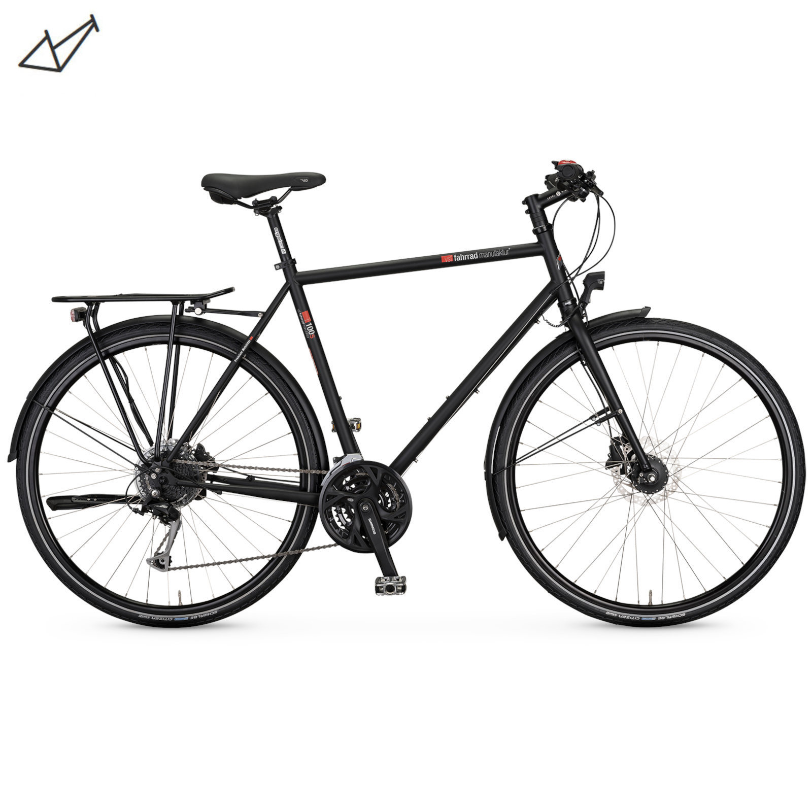 Available in two classic frame designs, the T-100 Sport with derailleur and rigid aluminium fork guarantees sporty cycling pleasure. On roads or forest trails – the T-100 Sport is a sporty all-rounder, and this version is equipped with a 27-speed derailleur and powerful disc brakes from Shimano. Like all of vsf fahrradmanufaktur’s trekking bikes, it is sturdy and durable, with a functional and high-quality total configuration.