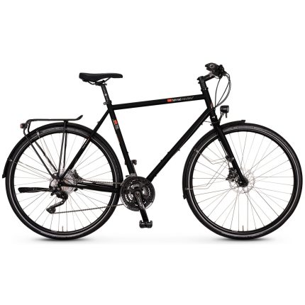 Trekking bikes from vsf fahrradmanufaktur are often the main means of transportation and an integral part of a life philosophy based on sustainability. In order to meet the resulting demands for durability and comfort, vsf are offering a model with 160 mm disc brakes from Shimano that is particularly suited for everyday use. This model combines the rugged steel frame in high manufacturing quality with a convenient Shimano 8-speed Alfine hub gear and tried and tested high-quality components: saddle from Selle Royal, racktime luggage rack, Busch & Müller lighting system, Schwalbe Marathon tires or ergonomic grips from Herrmans – discover the trekking bike for comfort-oriented people.